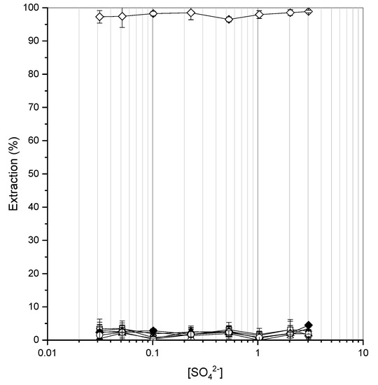 Extraction percentage of metal ions as a function of ammonium sulphate concentration on MTS9140 at 0.027 M H+. Al(III) = +, Co(II) = ☐, Cu(II) = ◇, Fe(III) = ◆, Ni(II) = ▲, Mn(II)= ✕, Zn(II) = ⃝.