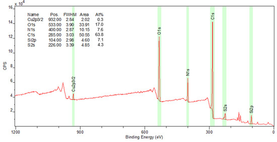 The XPS survey scan was used to determine surface elemental composition of powdered sample of Cu-loaded S914, given as atomic % (At%) in Figure 3. As can be expected for a resin bead with a polystyrene-DVB backbone, the most abundant element quantified was C (63.77 At%). In decreasing abundance, the remaining composition was determined to be O (16.98 At%), N (7.62 At%), Si (7.10 At%), S (4.28 At%), and Cu (0.25 At%) (Figure 3). All elemental peaks were clearly detected, as evidenced by the low ‘full width at half maximum’ (FWHM) values reported in the table within Figure 3.