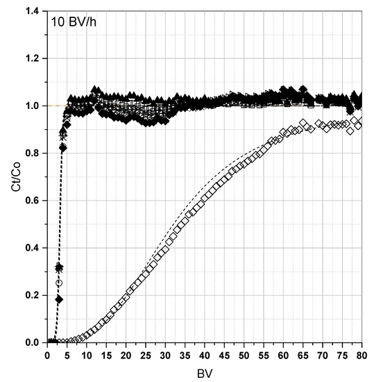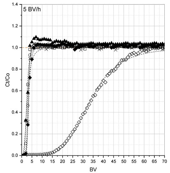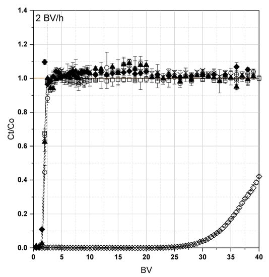 When reduced to 2 BV/h, a further sharpening of the breakthrough of ions was observed. For all metals other than Cu, almost immediate complete breakthrough occurred, after which concentration ratios plateaued at values between 1 and 1.1 (Figure 7). It is important to note that a decision was made to increase sampling resolution during the 2 BV/h flow rate study to increase the number of data points during the frontal portion of the breakthrough curve. Given the limited space for sample collection in fraction collectors, this resulted in only the first 40 BV being sampled. Nevertheless, sufficient Cu breakthrough was captured to allow effective modelling and comparison to other flow rates. Cu was first detected in effluent solutions beyond 25 BV throughput (Figure 7), much later than observed for 10 and 5 BV/h (BV 5 and 10, respectively).