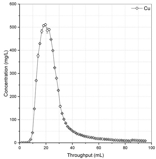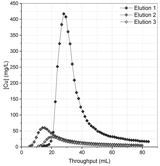 The considerably lower extent of Cu extraction during the second and third loading cycles (Figure 10) was reflected in the elution profiles for the respective cycles (Figure 11). However, for elution cycle two, the recovery efficiency was consistent with recovery during cycle one (88.46 and 85.34, respectively; Table 6). While the extent of Cu loading between cycle one and two was similar, the mass of Cu eluted differed greatly, with a decline in recovery efficiency from 88.46% to only 46.27% during elution cycle three (Table 6).