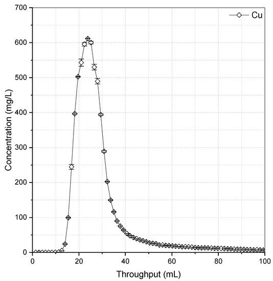 The elution profile of Cu from S914 using a 0.5 M solution of NaClO3 at pH 2 is presented in Figure 8. The concentration of Cu in effluent solutions increased sharply beyond 4 BV throughput, reaching a maximum concentration of 511 mg/L at 20 mL (~14 BV) throughput. Following peak maximum, Cu concentration exhibited a steep decline, which gradually levelled out to below 10 mg/L by the end of the experimental run; allowing the complete profile to be captured. Integration of the area below the curve (Table 5) revealed effective Cu elution by this eluent, with an overall Cu recovery percentage of 78.91%.