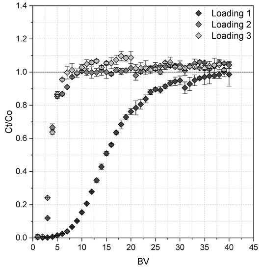 During the first loading cycle, typical Cu adsorption behaviour was observed, with complete breakthrough encountered at 40 BV throughput (Figure 10). Integration of the area above the breakthrough curve (with an upper boundary of influent PLS concentration) indicated the adsorption of 7.95 mg Cu during the first loading cycle. Following Cu elution, the resin bed was loaded again using the 400 mg/L Cu solution, but exhibited very low adsorption of Cu, with only 1.55 mg of Cu removed before complete breakthrough occurred during both the second and third loading cycles (Table 6).