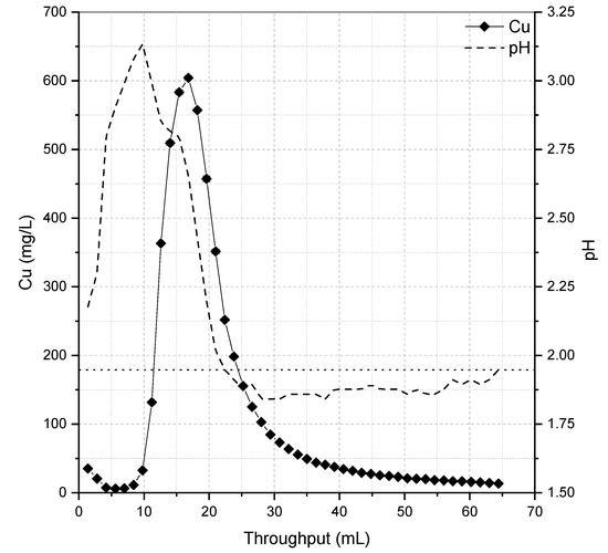 Cu concentration and pH of effluent solutions during elution of Cu from MTS9140 at 2 BV/h using 0.5 M NaClO3 (pH 1.95, HCl media, dotted horizontal line represents pH of eluent).