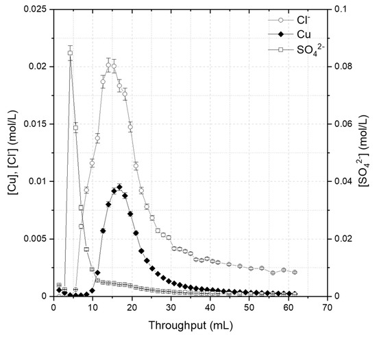 Concentrations of Cu, Cl−, and SO42− in effluent solutions during elution of S914 at 2 BV/h using 0.5 M NaClO3 (pH 1.95, HCl media, same Cu elution profile as presented in Figure 12).