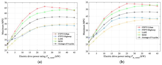 For hybridization of each IC engine vehicle with each of the electric drive power rating values listed in Table 3, the maximum MPG during each driving cycle and the average maximum MPG of the four driving cycles are calculated and plotted in Figure 2. The maximum MPG of each IC engine vehicle without the electric drive, i.e., Pm_rated = 0 kW, is also calculated and plotted for comparison and analysis.