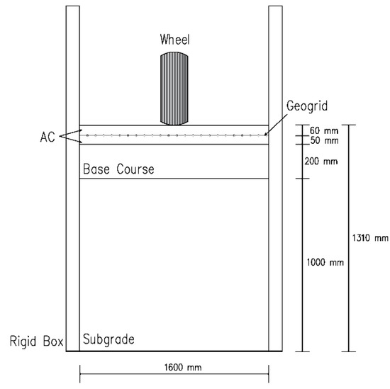 Rutting is one of the major problems facing asphalt pavement [1]. Rutting takes the shape of the vehicle wheel paths due to surface depression [2], usually extending in both asphalt layers and underlying unbound layers [3,4,5,6]. Found at traffic junctions of urban and non-urban roads, tire friction caused by periodic acceleration and deceleration generates shear stress and strain within the pavement structure [7,8]. Traffic densities, speed, and vehicle loads influence pavement rutting, as do weather conditions [9]. Pavements constructed over poor subgrade soil lead to pavement rutting, which results in a rapid increase in the need for maintenance funds, anticipated by the need for thicker asphalt layers and periodic failures. The performance of the roads’ pavement depends highly on the properties of the subgrade soil, as it serves as the foundation for the pavement [10]. The use of intermediate gradation aggregates reduces the rutting depth greatly compared to the use of fine gradation aggregates [11]. Nowadays, many industrial and academic engineers are seeking a method to improve pavement rutting resistance; some use asphalt binder modifiers, others drive towards using semi-flexible asphalts or cool asphalts as promising methods [1]. However, geo-synthetics are also being used in many civil engineering applications such as pavement improvement, retaining walls, dams, and embankments. Geo-grids, which are an important type of geo-synthetics, are frequently used to reinforce roadway structures, soil, and asphalt layers [12]. The performance of geo-grids is governed by the elemental material of the grid, the design of the mesh, the stiffness, the dimensions, and the arrangement in the pavement cross-section. Geo-grids improve the structural performance and extend the fatigue resistance, decrease degradation over time, and lower crack propagation. Using geo-grids can be shown to increase the structural capacity by a factor of 1.5 to 7.5 [13]. In addition, the position of the geo-grid in the flexible pavement structure is important due to its effects on the developed stresses within the road cross-section [14]. Baadiga et al. (2021) found that rutting deformations vary due to subgrade conditions, pavement layer thicknesses, and geo-grid types. Their study shows that the rutting depth was reduced by 22% to 69% using polypropylene and polyester geo-grids above the base layer. In addition, rutting depths at subgrade level was reduced due to the geo-grid by up to 90% compared to non-reinforced structures [15]. In an attempt to manage rutting distress, many theoretical models were suggested to anticipate the rutting rate of numerous pavement structures by utilizing the parameters acquired from lab tests (i.e., the Hamburg wheel test [16]) and accelerated pavement testing [17,18]. These rutting models enlightened pavement structure analysis and design. To improve the aspects of paved and unpaved road structures, many numerical evaluations of two-dimensional (2-D) and three-dimensional (3-D) finite elements-based simulations have been conducted. Pandey et al. (2012) constructed a 2-D PLAXIS axisymmetric finite element model to analyze the response of a geo-grid reinforced asphalt and discovered that the reinforcement contributed to a 22% reduction of asphalt tensile strains under static loading and a 14% under cyclic loading [19]. Faheem and Hassan (2014) concluded the outcome of a 2-D PLAXIS model analysis of the response of geo-grid reinforced asphalt. Reduced effective stresses under the wheel load area and vertical displacements were observed, which reflect the improvement of pavement behavior [20]. Taherkhani and Jalali (2016) assessed the usefulness of geosynthetics using an ABAQUS model under different loads and using different geo-grid stiffness values to lower critical strains in flexible pavements. By utilizing the geo-grids, the decrease of asphalt compressive strains and tensile strains in the subgrade soil was noticed [21]. Al-Jumaili (2016) managed to evaluate the impact of the geo-grid position when subjected to cycling loadings using 3-D PLAXIS axisymmetric simulations. He concluded that the pavement mechanical response was affected significantly when placing the geo-grid between asphalt concrete layers [22]. Correia (2018), using a 2-D Plaxis axisymmetric finite element model, noticed reductions of vertical displacements and strains [23]. Despite this, such reductions are not significantly affected by the increases in geo-grid stiffness, which concludes that the presence of the geo-grids influences the structural functioning of the pavement. Previous studies attempting to evaluate the performance of the geo-grid reinforced asphalt revealed the benefits of assessing the effect of geo-grids on the pavement mechanical behavior. However, these studies have not focused on identifying the optimum positioning of the geo-grid in a pavement structure. The prediction of vertical compressive stresses developed in the reinforcements is anticipated to be specifically helpful in achieving this goal. This study conducts a 3-D finite elements simulation to assess the response of flexible pavements reinforced by a geo-grid layer. The assessment of the stress distribution in the pavement layers was performed using ANSYS numerical simulations. The model was validated by comparing the experimental outcome acquired in an accelerated large-scale pavement model with the predictions from the numerical model [24].