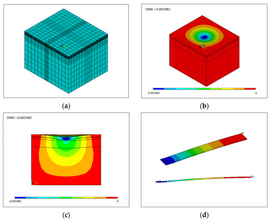 The four figures are as follows; (a) The 3-D finite element model; (b) The rutting deformation developed from the load; (c) Cross-section view of the rutting deformation; (d) Half surface strip of the deformed model.