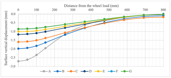 As shown in Figure 5, the surface vertical displacement was affected due to the change in geo-grid depth positioning. It was observed that the deeper the geo-grid was placed, the better the rutting resistance was noticed. When the geo-grid was placed on top of the subgrade (310 mm), the effects of the rutting resistance were best. However, placing the geo-grid lower than that level had no improvement on the surface vertical displacement, as noticed by the overlapped curves of F and G. Position B had 25% rutting resistance improvement compared to position A, position C had 38% improvement compared to position A, position D had 55% improvement compared to position A, position E had 61% improvement compared to position A, and position F and G had 67% improvement compared to position A, by comparing the ratio of the average values for the first 100 mm values.