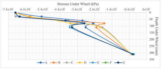 Figure 6 illustrate the effect of the geo-grid depth on the vertical stress distribution in the pavement models, resulting from a parametric evaluation. The negative sign is meant to specify that the stress was compressive. Of course, the stress on contact with the wheel would be the same as the loading condition of 700 kPa contact pressure. The seven different curves representing the different geo-grid depth positioning all show a close path range. However, two out of the seven curves behaved differently. C and D had a different behavior where both were under the lower half of the asphalt layer thickness, which would be the tensile stress side of that layer. Nevertheless, each curve showed a different behavior depending on its depth.