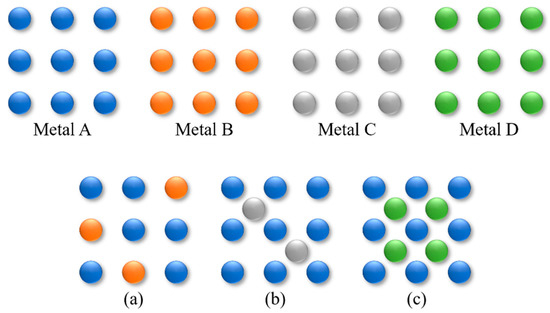 Effective approaches reported so far include the modification of Ni metal with organic modifiers, reducible metal oxides, and other metals [10,11]. The addition of organic modifiers to the reaction mixture requires subsequent tedious and costly separation. To ensure the occurrence of strong metal-support interactions (SMSIs), catalyst preparation remains critical; for example, the amount of partially reducible metal oxides present must be precisely controlled. The alloying with an additional metal to form intermetallic compounds or alloys will offer an opportunity to design new catalysts with improved activity, selectivity, and stability because the surface atoms have different electronic and geometric structures from those of their monometallic counterparts [12,13]. In the early 1960s, a study on bimetallic catalysts was initiated by J. Sinfelt who worked at Standard Oil Development Company, known today as ExxonMobil Research and Engineering Company, and bimetallic catalysts have continued to attract growing attention in the past decade [14,15]. Alloys are classified into two groups, solid-solution-based and intermetallic-based alloys, depending on their structures (Figure 1) [16]. Solid-solution alloys, in which different metals are randomly mixed at the atomic scale, generally form one of three basic crystal structures: body-centered cubic, face-centered cubic, or hexagonal close-packed structures [17]. The crystal structure of solid-solution alloys changes depending on both their constituent elements and composition [17]. Solid-solution alloys are classified into two groups: substitutional and interstitial solid-solution alloys (Figure 1a,b) [18]. The difference is whether the atoms of the counterpart metal replace or squeeze between those of the parent metal. Intermetallic compounds are composed of different metals with an ordered structure and often a well-defined and fixed stoichiometry (Figure 1c) [19].
