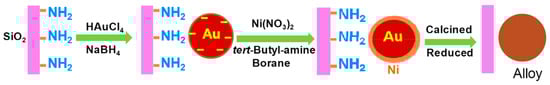 SiO2-supported Ni-Au alloy nanoparticles with a variety of Ni/Au molar ratios were applied for the hydrogenation of 3-NS and demonstrated higher activity or chemoselectivity for 3-AS than their monometallic Ni/SiO2 counterparts, as shown in Table 3 (e.g., entry 1 vs. entry 4, entry 2 vs. entry 5, entry 3 vs. entry 6) [11]. In general, it is difficult to prepare a homogeneous Ni-Au alloy because of the substantial different reduction potential and immiscibility of the two metals at low temperature [11]. H. Wei et al. used tert-butylamine as a weak reducing agent in the second preparation step to form Ni nanoparticles on the Au surface (Figure 5). Extended X-ray absorption fine structure (EXAFS) results revealed that a large fraction of Ni was alloyed with Au in the Ni3Au/SiO2 sample after the hydrogen reduction at 550 °C. The enhanced catalysis was because of a synergistic effect between the two metals. Here, it was concluded based on H2 uptake that the formation of the Ni-Au alloy enabled H2 molecules to be activated more easily, improving the catalytic activity for chemoselective nitro hydrogenation. In the Ni-Au bimetallic catalysts, the activity greatly increased with increasing Ni content, while the chemoselectivity remained unchanged at a high conversion of 90% (Table 3, entries 1–3).