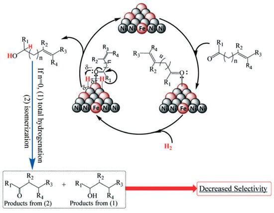 Plausible mechanism for the chemoselective hydrogenation of unsaturated carbonyl compounds to the corresponding unsaturated alcohols by Ni-Fe-based alloy. Adapted from [65] with permission of Royal Society of Chemistry, copyright 2017.