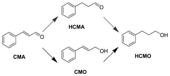 In addition to the chemoselective hydrogenation of unsaturated carbonyls to unsaturated alcohols such as FFR to FFA, the production of saturated carbonyls from their corresponding unsaturated carbonyls also has industrial and biological applications [71]. Cinnamaldehyde (CMA) is an important unsaturated aldehyde that is used in industrial applications, and its selective hydrogenation product, hydrocinnamaldehyde (HCMA), is widely used in the fragrance industry, the synthesis of drugs for AIDS, and the development of other pharmaceuticals (Scheme 3) [71,72].