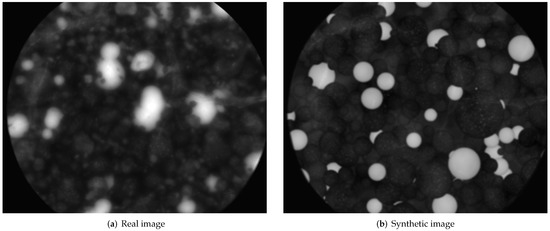 The real images (see Figure 1a), which motivated this publication and were used as test data (see Section 2.2) for the proposed method, were attained using an endoscopic camera (SOPAT Pl Mesoscopic Probe [15]), situated in the catalyst cycle of an FCC plant. A specialty of the proposed method is the use of synthetic training and validation data (see Figure 1b, Section 2.1 and Section 3.1.2), to avoid the laborious manual annotation of the large amounts of data, which are usually required for the training of CNNs.