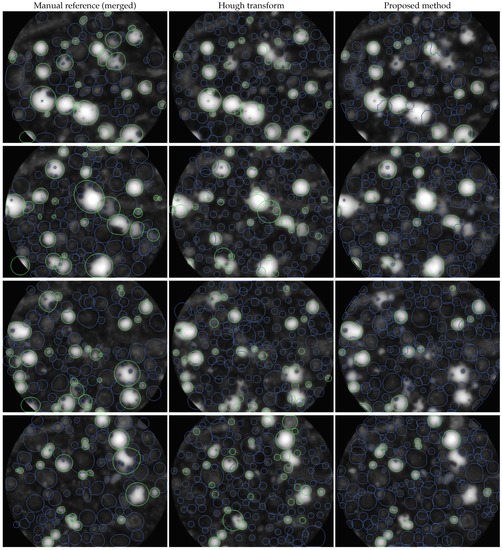 The dark and light particle edges resulting from the previous processing step are used to carry out two separate circle Hough transforms [36], one for each particle class. To improve the detection results for the respective particle class, circles that are primarily outside of the corresponding particle mask are being removed.