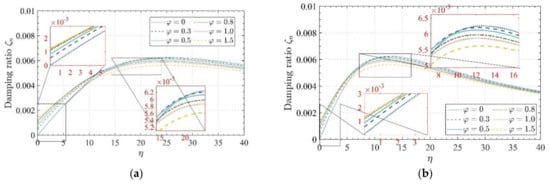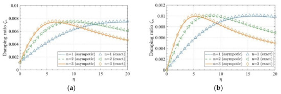 Impact of loss factor of the internal rubber damper on cable modal damping with and: (a) n = 1; (b) n = 2.