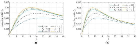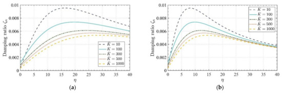 Impact of stiffness of the internal rubber damper on cable modal damping with and: (a) n = 1; (b) n = 2.