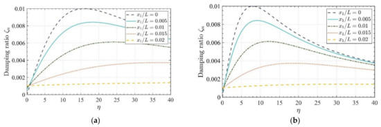Impact of location of the internal rubber damper on cable modal damping with and: (a) n = 1; (b) n = 2.