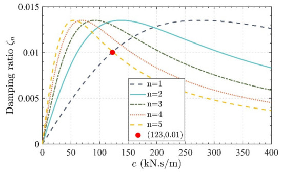 For cable multimode vibration control, the damper design needs to consider all possible modes that are prone to vibrations [37]. For this reason, it is necessary to study the cable multimode damping effect of installing both an internal rubber damper and an external viscous damper. The external viscous damper damping coefficient is determined to control cable modes with a frequency within 3 Hz [8]. In addition, considering the requirements for controlling rain-wind induced vibration, the target damping ratio is set to 0.005, and a safety factor of two times is used herein, and then the damping ratio that the damper needs to provide should not be less than 0.01. The cable fundamental frequency is 0.59 Hz, as shown in Table 1; therefore, the first five modes are considered in the damper design.