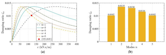 In order to meet the damping requirements of vibration reduction after installing the internal rubber damper, the installation height of the external viscous damper needs to be further increased. Figure 9 shows the optimization result of the external viscous damper, considering the installation of the internal rubber damper. In this case, the installation height of the external viscous damper needs to be increased to 0.031, and the optimal damper coefficient is . The modal damping ratios of the first five modes are shown in Figure 9b; clearly, the modal damping ratio of each mode has reached the target requirement that the cable damping ratio is not less than 0.01.