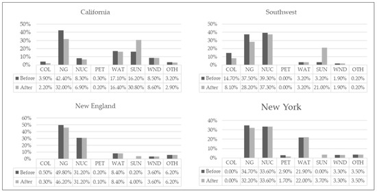 This study provides findings from a comparative analysis considering the massive integration of solar power plants in four regions of the United States electrical system: (1) California, (2) Southwest, (3) New England, and (4) New York. The analysis in the network was carried out per hour, considering the changes in net generation, the net generation error with demand, and the energy power peaks. Figure 1 summarizes the percentages of generation by energy resource before and after the massive incorporation of photovoltaic plants (100% penetration). These plots show that having 100% penetration of solar generation impacts the reduction of the use of fossil fuels. The greatest changes between before and after were found in the region of California and Southwest, as seen in Figure 1, are those that generate the greatest amount of solar energy.