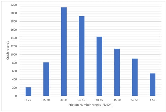 In this study, the crash injury severity is classified into three categories: O for property damage only (PDO) or no injury crashes, BC for possible or minor injury crashes, and KA for the highest severity level, which is disabling or fatal injury crashes. PDO crashes represented 75.9% of the total crash records. Possible and minor injury crashes accounted for 22.3%, while disabling and fatal injury crashes comprised 1.8% of the data. The investigated roadway attributes were pavement surface friction, intersection type, intersection location attributes, number of lanes, grade (uphill, downhill, and level), horizontal curvature, roadway functional classification, roadway surface type, guardrail presence, presence of rumble strips, median type, median width, right shoulder type, and right shoulder width. The pavement friction values (FN40R) ranged from 19 to 71 with an average of 40. Figure 1 illustrates the friction number distribution for the crash records.