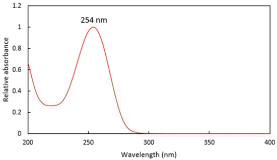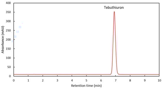 There was no clear consistency in the literature for the λmax or detection wavelength for tebuthiuron. Weber [17] reported λmax values of 252 nm in neutral solution and 261 nm in acidic conditions for tebuthiuron. Lourencetti et al. [18] found a λmax of 255 nm, while more recently, Ferreira et al. [19] reported the λmax of tebuthiuron to be 253 nm. Similarly, Lydon et al. [15] used a wavelength of 254 nm for the quantification of tebuthiuron via HPLC, while other authors have used 245 nm [20] and 247 nm [16,18].