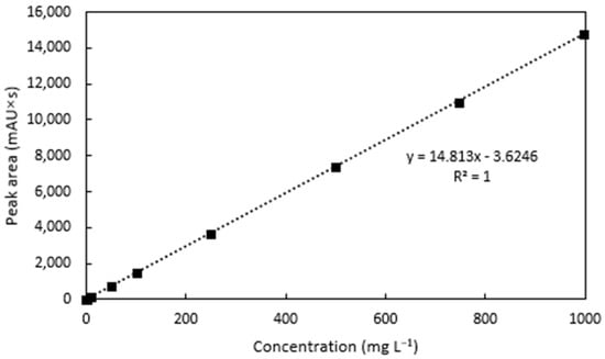 For the analysis of linearity, the tebuthiuron standards were found to be linear over the range of 0.1–1000 mg L−1, with an R2 value of 0.9999 (Figure 5).