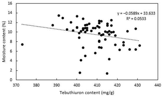 In the samples of Regain400, a moderate negative correlation between the tebuthiuron and moisture content was found (Figure 6); however, this relationship was very weak (R2 = 0.05).