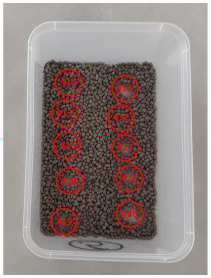 Based on preliminary results and observations during the manufacturing process, it was thought that there could be a high level of variation in tebuthiuron content between different portions of each Regain batch. To test this hypothesis, ten samples were randomly selected from different parts of one Regain400 sample (see Figure 3). These were then ground, extracted and analysed separately (each in triplicate).