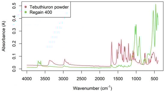 Figure 8 shows the FTIR spectra of one of the Regain samples, overlaid with the FTIR spectra of a sample of pure tebuthiuron powder. The tebuthiuron spectrum appeared similar to literature records on SpectraBase (https://spectrabase.com/spectrum/Gwi6TOkmgNy; accessed on 22 June 2022), with a complex pattern of peaks. The major peaks and their aetiological bonds are summarised in Table 5. Not all of the peaks between 1500–900 cm−1 were able to be confidently assigned identities, due to the complexity in this region. The Regain400 sample showed additional peaks at 1026, 1002, 910 and <600 cm−1, due to absorptions from the other matrix constituents. In contrast, the pure tebuthiuron powder samples showed minimal absorbance in this region (1026–910 cm−1).