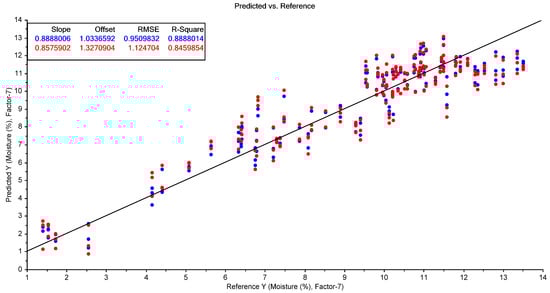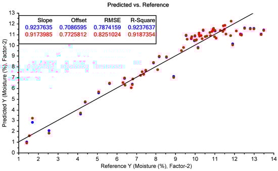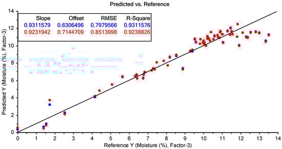 The results of the best-performing PLSR model for the prediction of moisture content using the FTIR spectra of the Regain samples (using SNV pre-processing). The blue points show the model calibration, while the red points show the model cross-validation.
