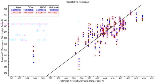 The results for the prediction of moisture and tebuthiuron content from the powdered samples are shown in Table 8. Interestingly, the moisture prediction was less accurate when using the powdered samples compared to the whole granules, with an RMSECV of 1.02% for the best-performing model, compared to an RMSECV of 0.85% for the granules. This is an important observation from a rapid quality control viewpoint, as it indicates that NIR spectra obtained from the intact/whole Regain granules will perform just as well—if not better—than spectra obtained from the powdered samples, thus removing the need for the time-consuming grinding process.