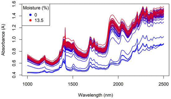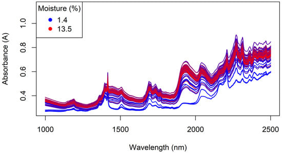 The handheld MicroNIR spectra of the Regain granules, coloured by moisture content.