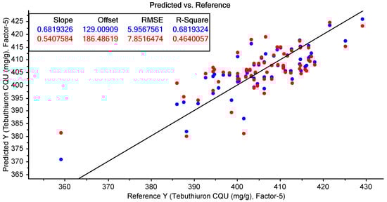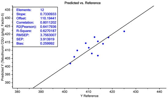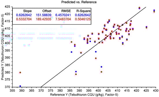 It should be noted that the single Regain200 sample was excluded from the tebuthiuron prediction results, as the model had only previously been trained on the Regain400 samples; therefore, we could not predict the tebuthiuron content of the Regain200 sample with acceptable accuracy.