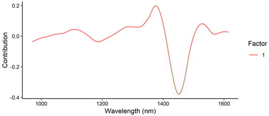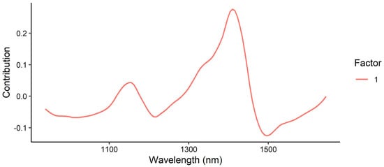 The loading plot of the PLSR model for moisture content (Figure 20) shows the greatest contribution at 1410 nm, corresponding to the second overtone of H2O. A minor positive contribution was also observed at 1156 nm (CH3 second overtone) as well as negative contributions around 1497 nm (likely corresponding to the second overtone of the amide region).