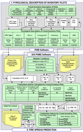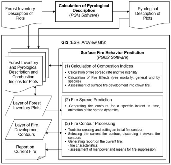 Flowchart of the PGM and PGM2 software structure (for calculation of pyrological description of forest inventory plots and surface fire behavior prediction).