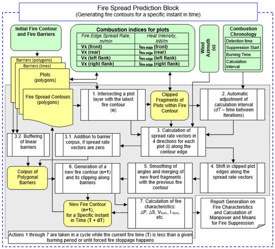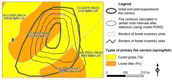 The main criterion for selecting past fire events for retrospective performance tests was the quality of fire outlines. Preference was given to GIS-based outlines which is very important for the accurate positioning of fires for computerized prediction of their spread. The outlines helped to identify the initial and final contours of a fire. Intermediate contours were, unfortunately, absent in almost all outlines. The initial and final contours of the fire were transferred to the computerized VF map. The following data were entered: fire season period, fire weather index value, relative air humidity, wind direction, and wind speed. Then, fire spread was predicted using the developed PGM2 software in the Avenue object-oriented programming language as a software module operating in ESRI ArcView GIS 3.2 (Redlands, CA, USA).
