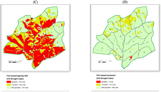 On the basis of VF maps, maps of current fire hazards (Figure 4C,D) are created depending on weather conditions, or rather, on the drought class according to weather conditions. Examples are given for the 3rd drought class corresponding to 1001–3000 conventional units of the Russian fire weather index (PV1), which is calculated taking into account air temperature and dew point, as well as precipitation. The color reflects ignitability dynamics: red color stands for areas ready to support flaming combustion (ignitable), green color shows areas not ready to support flaming combustion (non-ignitable), and yellow color indicates areas in a transient state in terms of ignitability dynamics that can be clarified directly during a fire event: if flaming combustion is present on such areas, then they are all colored red on the map; if it is absent, then these areas are colored green. Such information helps fire suppression commanders make up an optimal fire suppression plan and correctly allocate manpower and means.