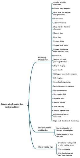 Since control techniques have been more broadly reviewed, such as, for instance, in [7,8,9,10,11], the objective of this paper is to provide information about the different design methods for torque ripple reduction in several topologies of permanent magnets motors. For that purpose, the design methods are classified in three groups, which are: geometry optimization, slot/pole number combination, and stator winding type. In every category, some application examples from research papers are presented, and readers are encouraged to refer to those papers for mathematical and experimental details.