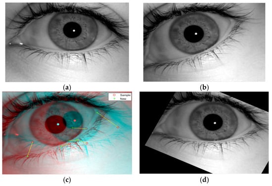 Image registration is a process during image processing that overlaps two or more images from various imaging equipment or sensors which are taken at different angles to geometrically align the images for an analysis and to reduce the problems of misalignment, rotation and scale, etc. If the angle of the iris is changed (i.e., the person kept their eye near the scanner at a different angle or a different position), then the iris pattern at the same position as in other image will be changed, and it can cause mismatch. As it can be seen in Figure 1, the images were taken at different positions as well as angles, so we needed to perform image registration. If the new image In (x, y) is rotated or tilted at any angle, it will be compared with the sample image Is (x, y), and it will automatically be rotated to the ideal position. There are different processes in image registration based on point mapping, multimodal configurations and feature matching. These points will be detected in both of the images to find whether they are at same angle and position or not, and if they are not, then the images will be aligned by adjusting these points, respectively. When we were choosing a mapping function (u (x, y), v (x, y)) for the ordinal coordinates transformation, the intensity values of the new image were made to be close to the corresponding points in the sample image. The mapping function must simplify to Equation (2).