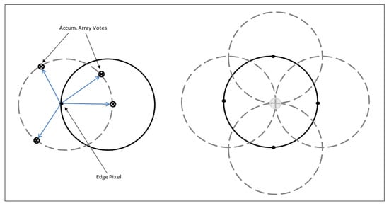 The CHT use a 3D array with the first two dimensions, representing the coordinates of the circle, and the last third of it specifies the radii. When a circle of a desired radii is drawn at every edge point, the values in the accumulator (the array which will find the intersection point) will increase. The accumulator, which keeps count of the circles passing through the coordinates of each edge point, will vote for the highest count as shown in Figure 4.
