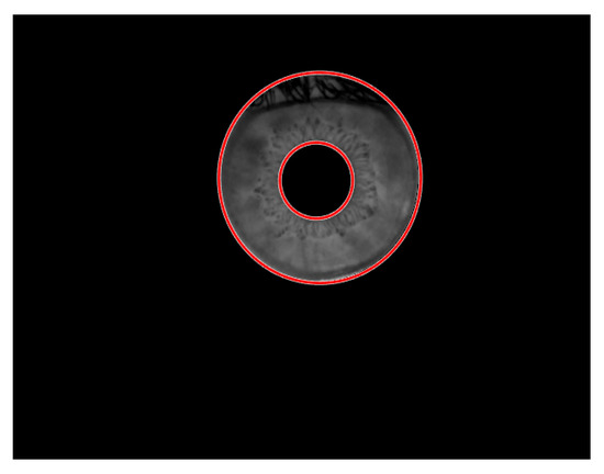 The coordinates of the center of circles in the images will be the coordinates with the highest count. For efficient recognition, the circular Hough transform was performed on the iris–sclera boundary first, and then, on the iris–pupil boundary. The segmentation using the circular Hough transform method is shown in Figure 5. After the circular portion was detected, the next step was to separate this circular portion from the eye. We have applied the mask of zeros to extract the iris from the eye as shown in Figure 6, and the circle detection is represented in Algorithm 2.