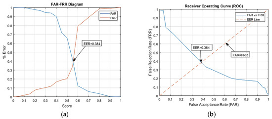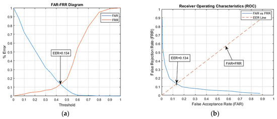 To check the accuracy of the proposed system, it was evaluated using the false acceptance rate, the false rejection rate and the equal error rate. The equal error rate (EER) is achieved at a point where the FAR and FRR overlaps; the lower the EER is, the better the performance accuracy of the system will be. The matching algorithm uses a threshold value which will determine the closeness of the input iris to the database iris. The lower the threshold value is, the lower the FRR will be, while the FAR will be higher, and a higher threshold value will lead to a lower FAR and higher FRR, as shown in Figure 12 and Figure 13. EER is the point at which the FRR equals the FAR, and it is considered to be the most important measure of the biometric system’s accuracy. The proposed iris recognition system gives an EER = 0.134 as shown in Figure 12, while using a PCA-based method for iris recognition gives an EER = 0.384 as shown in Figure 13.