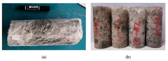 The experimental salt rock core used in this study is taken from the main salt layer in Sanshui Basin, Guangdong Province, with a buried depth of about 1200 m. Some core columns collected by the coring barrel are shown in Figure 1a. A core from the core column was drilled and processed into standard rock sample for experiments (Ø50 ∗ H100 mm), as shown in Figure 1b. As the salt rock is easily dissolved in water, in order to avoid large damage to the core caused by the conventional coring method, the wire cutting process was adopted for this coring. During processing, the wire cutting fluid did not contain water or react with the core, which ensured the core is not damaged and polluted.