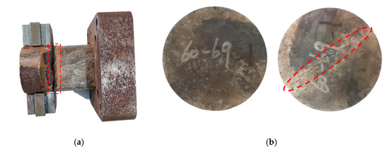 The direct tensile test adopts the self-designed core direct tensile loading device, which can directly conduct the direct tensile test on the press, as shown in Figure 2a. All the cores were processed into an I-shape for the experiments. The Brazil splitting test method was used for indirect tension. The tensile properties and parameters of salt rock were determined by comparing the two methods. Figure 3 shows that, in the direct tension test, the salt rock fracture occurs at the neck (as shown in Figure 3a, the red dotted line), and the fracture surface is basically perpendicular to the axial direction. However, in the indirect tension test, the core is split into nearly symmetrical halves. The results of both experiments are shown in Table 2. The tensile test shows that there is little difference between the core strength measured by the two methods, indicating that both methods can be used as the core tensile strength measurement mode. The experimental results show that the tensile strength of salt rock in Sanshui Basin is not high, ranging from 1–2 MPa with an average of 1.51 MPa. For salt cavern gas storage, the tightness of the cavity is one of the key parameters for its safety assessment. In the process of construction and operation, it is necessary to control the pressure in the cavity to avoid tensile damage in key parts, which may lead to the risk of cavity instability or sealing failure.