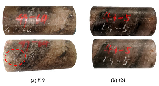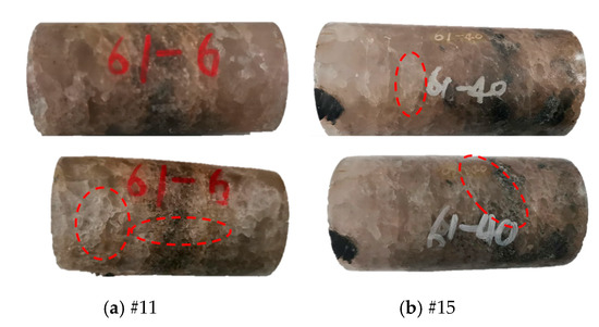 The core length used in the uniaxial and triaxial compression tests of salt rock in Sanshui Basin was about 100 mm. It can be seen from some core photos after the experiment that, under uniaxial compression, tensile cracks along the axial direction were produced in the salt rock (as shown in the red dotted line at the lower part of Figure 4a), while under triaxial compression, no obvious cracks or damage were produced in the salt rock samples, and the salt rock samples were in a radial expansion state. Core photos show that the crystal grains of salt in the salt rock fabric of Sanshui Basin are large (as shown in the red dotted line circle in Figure 4b above), visible to the naked eye, and the size is inlaid with an irregular distribution. There are also randomly distributed impurity grains of different sizes inside. The experimental results show that under the action of stress, there is dislocation, sliding and fragmentation between the salt rock crystal particles. Large salt rock crystal particles are broken into many small crystal particles, and the boundaries between the particles are denser and clear (as shown in the red dotted circle below Figure 4a,b). Uniaxial compression test results in Table 3 show that the average peak compressive strength of salt rock is 26.04 MPa, which is about 17.2 times of its uniaxial tensile strength, and the average elastic modulus and Poisson’s ratio are 6.16 GPa and 0.296, respectively. Under uniaxial compression, the stress–strain curve of the salt rock in the salt mine has obvious elastic–plastic behavior. The elastic stage is short. It then goes through a long plastic flow stage. Before the peak failure, the axial strain and radial strain both increase significantly, and the volumetric strain also shows that the dilatancy of salt rock core under uniaxial compression test is obvious.