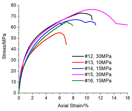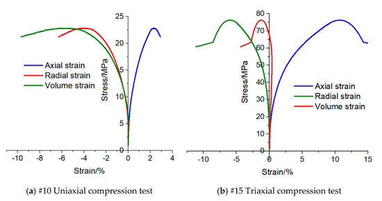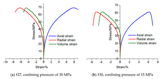 Under the triaxial compression test, the peak strength of the rock generally increases with the increasing of confining pressure. Compared with the uniaxial compressive strength, the strength of the core under triaxial compression has been greatly improved, and the elastic modulus also significantly increased, as shown in Table 4. The stress–strain curves (Figure 5) show that the strain of salt rock increases significantly when it reaches failure under triaxial compression test. The axial strain of the core is larger than the radial strain under the confining pressure, indicating that the confining pressure has a greater impact on the radial deformation of the core salt rock. Volume strain shows that at the initial stage of the experiment, the core is mainly compacted, which is obvious from the triaxial compression experiment. Then, the damage occurs in the rock when microcracks are generated and expand, and volume expansion happens at the beginning of the experiment. The core compaction is significant, and under the influence of confining pressure, the volume expansion is significantly weakened compared with the uniaxial compression condition. In Figure 6, axial stress and strain under different confining pressures show that, with increasing of confining pressure, the peak strength of salt rock does not increase by the same factor, but rather increases slightly. After reaching peak strength, the salt rock still has a high bearing capacity.