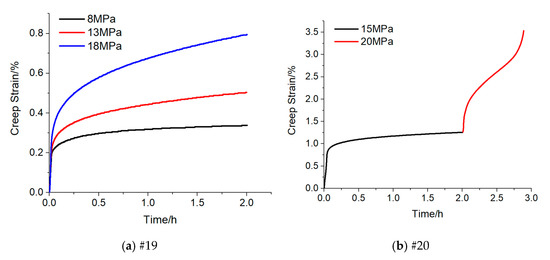 The rheological properties of salt rock are of great significance to the long-term operational safety of underground projects. Figure 9 shows the pre and post creep test photos of some salt rock cores in Sanshui Basin under uniaxial and triaxial conditions. The creep test did not cause large apparent damage to the salt rock core. After the test, the rock core appears to be complete, and there were no fractures or fragmentation. The only difference was in the boundary between particles, which appeared clearer and more obvious (as shown in the red dotted ellipse in Figure 9a below). Under the uniaxial creep test, the creep rate increases with the increase of axial pressure, as shown in Figure 10a. Table 6 shows that the accelerated creep stage occurs in uniaxial creep of individual cores, such as core #18 under an axial pressure of 24 MPa and core #20 (as shown in Figure 10b) under an axial pressure of 20 MPa, while individual cores (such as #17) still do not enter the accelerated creep stage under an axial pressure of 25 MPa, reflecting the heterogeneity of the stratum, indicating that there are differences in properties of salt rocks even in the same mining area.