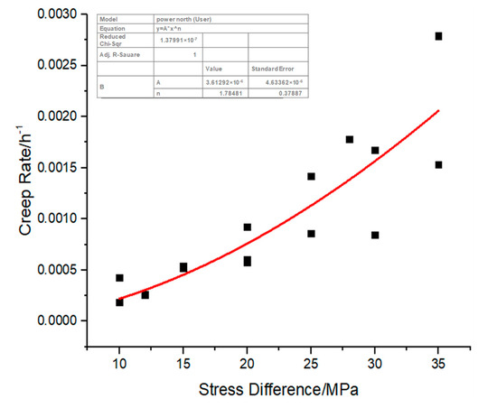 The confining pressure of the triaxial creep test was set according to the stress state of the coring formation depth. Under the triaxial creep test, the deviatoric stress is in direct proportion to the creep rate. The greater the deviatoric stress, the greater the creep rate (as shown in Table 6). When the confining pressure is fixed, the salt rock does not enter the accelerated creep stage with the increase of deviatoric stress. Even if the deviatoric stress reaches 35 MPa, there is no accelerated creep phenomenon, indicating that the confining pressure has a significant limiting effect on the salt rock creep. According to Figure 11, the fitting results of creep rate show that the creep rate is exponential with the deviatoric stress.